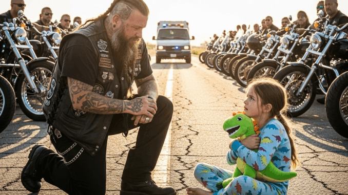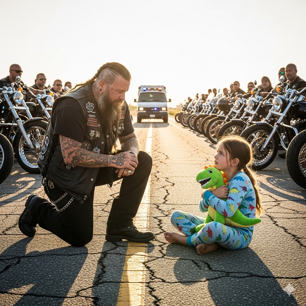 Cincuenta motociclistas formaron un círculo alrededor de Emma, con los motores acelerando como un latido. El cuero y el cromo se convirtieron en una fortaleza. Ella se sentó en la moto de Tom, agarrada al manillar, con su dragón de juguete apretado contra el pecho.