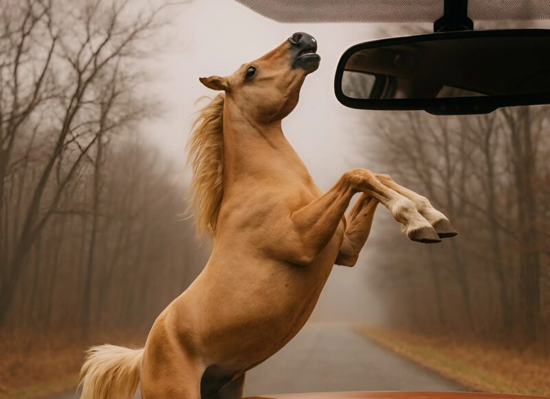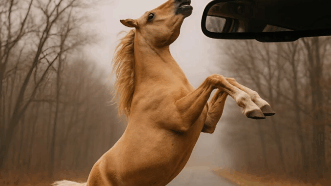 Frente a mí, encabritado sobre sus patas traseras, estaba el caballo. Resoplaba, golpeaba el asfalto con los cascos y miraba fijamente a través del parabrisas como si intentara detenerme. El corazón me latía tan fuerte que al principio no me atreví a salir. Pero el caballo, claramente, no iba a huir; estaba nervioso y parecía querer decir algo.