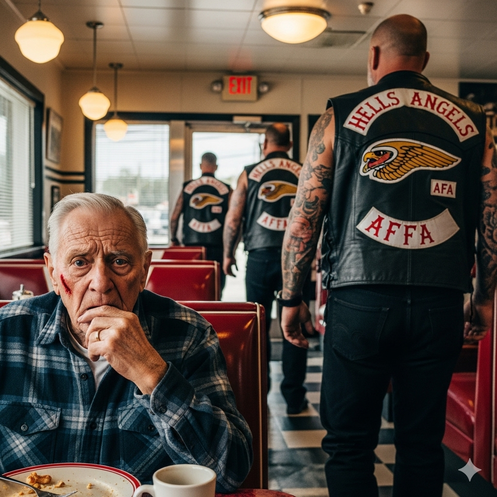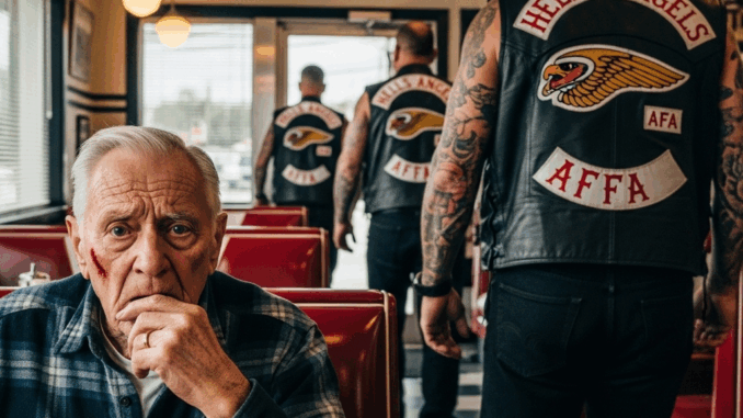 En un tranquilo restaurante, un anciano estaba sentado solo, temblando pero orgulloso. Momentos después, la mano de un matón le golpeó la cara, silenciando la sala. Nadie se movió. Nadie habló. Pero una hora después, la puerta se abrió y el silencio se rompió. Cuando su hijo entró con los Ángeles del Infierno, bienvenidos a Sombras de la Dignidad.