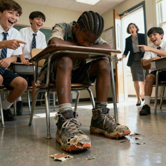 “¡Miren los zapatos de payaso de Malik!”, gritó alguien, y la clase estalló en carcajadas. Sus zapatillas estaban rotas por las costuras, la suela izquierda colgaba suelta como una solapa. Malik sintió que le ardía la cara, pero siguió caminando, con la mirada fija en el suelo. Sabía que no debía responder.