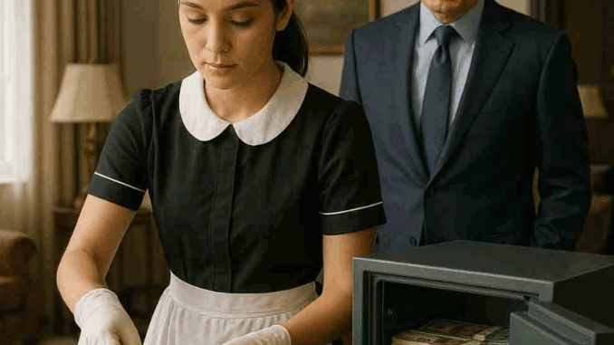 Clara entró al estudio con un trapo para limpiar el polvo. Se quedó paralizada al ver la caja fuerte abierta. Por un momento, miró a su alrededor con nerviosismo. El corazón de Arthur se aceleró. « Aquí viene», pensó. «Nadie puede resistirse a la tentación cuando es tan fácil».