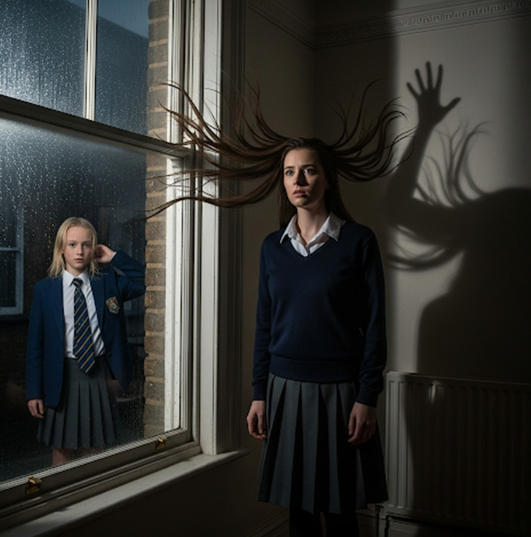 Era más alta que ella. Más delgada. Con brazos largos y dentados y una cabeza que se movía como una marioneta rota. Y cuando salió al pasillo, la sombra no se quedó detrás de ella, se movió a su lado. Luego frente a ella.