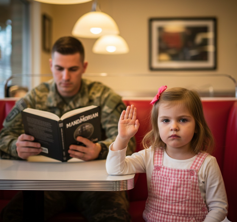Las familias se acomodaban en sus reservados, los camioneros bebían café humeante y una vieja gramola zumbaba suavemente en un rincón. El sargento Daniel Whitmore, recién llegado de una misión, estaba solo en la barra, revolviendo distraídamente su café negro. Su mirada penetrante, entrenada para percibir detalles que otros pasaban por alto, se posó en una pequeña figura al otro lado de la sala.