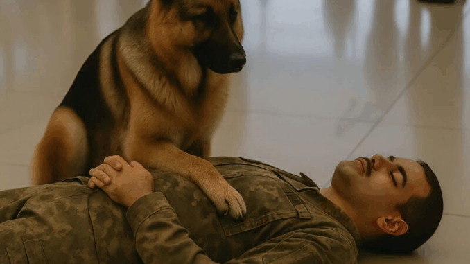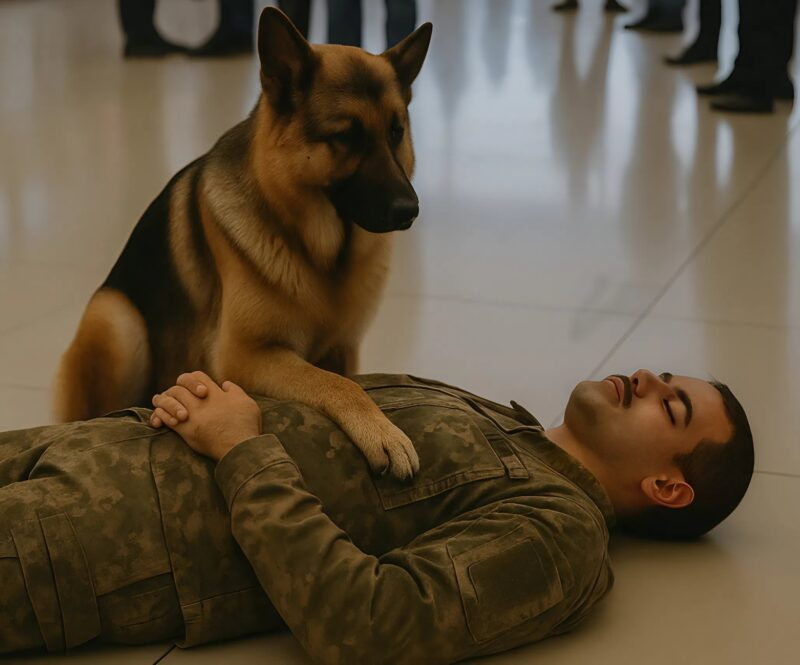 Los guardias de seguridad se acercaron rápidamente, pero el perro los recibió con una mirada seria y fuertes ladridos de advertencia. La multitud se puso tensa; muchos pensaron que el soldado había perdido el conocimiento, y su fiel perro no dejaba que nadie se acercara.