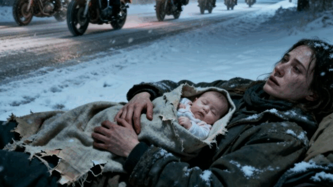 En medio de una tormenta de nieve, una mujer sin hogar dio a luz en la acera. Cuando sus gritos se desvanecieron en la fría noche, diez motores rugientes aparecieron en el oscuro horizonte…