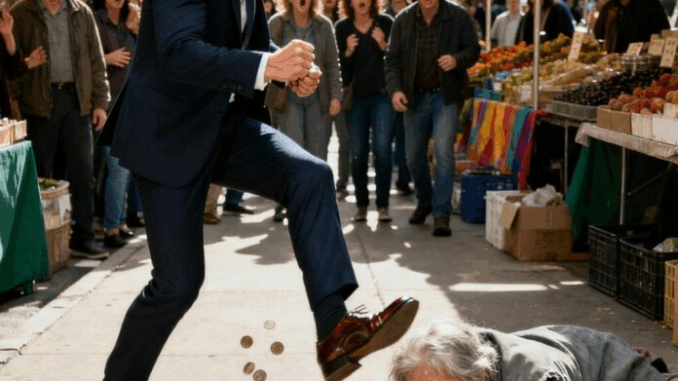 Al pasar junto a él, la mujer extendió la mano hacia su pierna por accidente, quizá confundiéndolo con alguien que le ofrecía ayuda. El orgullo de Daniel se encendió. Sin pensarlo, retiró la pierna de un tirón y apartó la mano de una patada , murmurando: «No me toques». El movimiento fue más brusco de lo que pretendía, y la mujer cayó hacia atrás, derramando las monedas de su vaso sobre el pavimento.