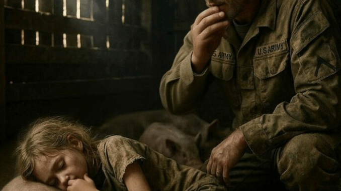 Al rodear el establo, se le heló la sangre. Su hija Lily, de siete años, estaba acurrucada en el corral, dormida en el barro, descalza, con sus bracitos rodeándose a sí misma para calentarse. Una manta rota apenas le cubría las piernas. Tenía la mejilla manchada de lágrimas secas y tierra.