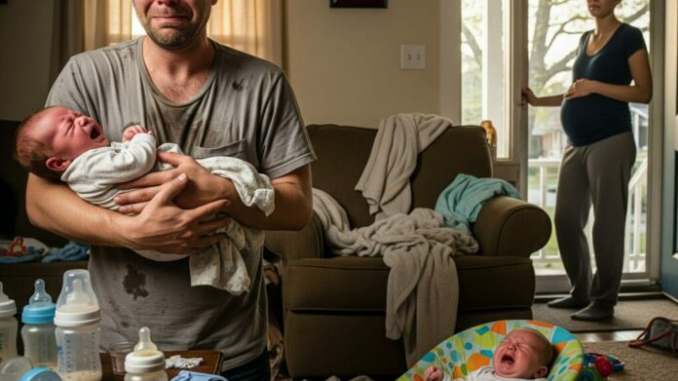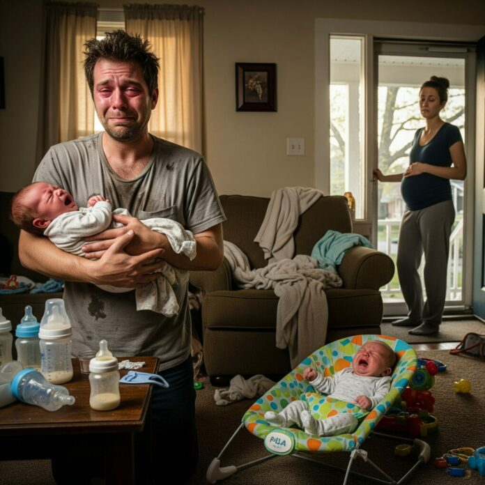 Mark estaba de pie en medio de la habitación, con la camisa manchada de vómito, intentando sujetar a un bebé que lloraba mientras el otro pateaba en el sofá. Había biberones esparcidos por la encimera de la cocina. La pañalera yacía volcada como si la hubieran registrado en un robo. Mark susurraba: «Por favor, amigo… por favor, deja de llorar…», con la voz temblorosa.